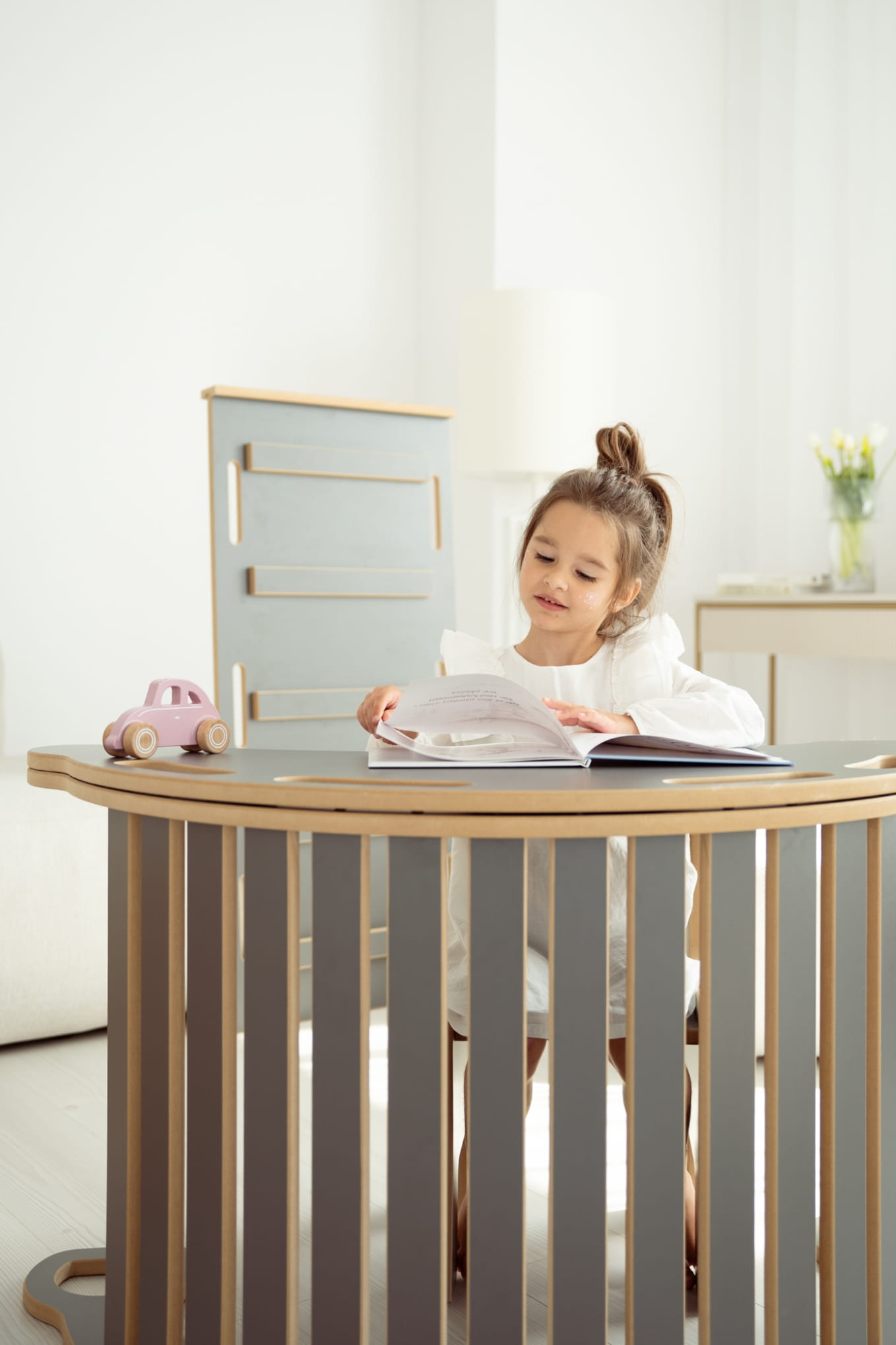W kilka sekund bujak można zamienić w biurko, wystarczy tylko nałożyć na niego blat! Posiada cztery otwory, w które można włożyć kredki i inne przybory, dzięki czemu zbieranie pisaków z podłogi odejdzie w niepamięć. Laminat jest odporny na zabrudzenia. Blat dzięki mocowaniu w płozę nie przesuwa się, a jego zakładanie i ściąganie trwa kilka sekund.